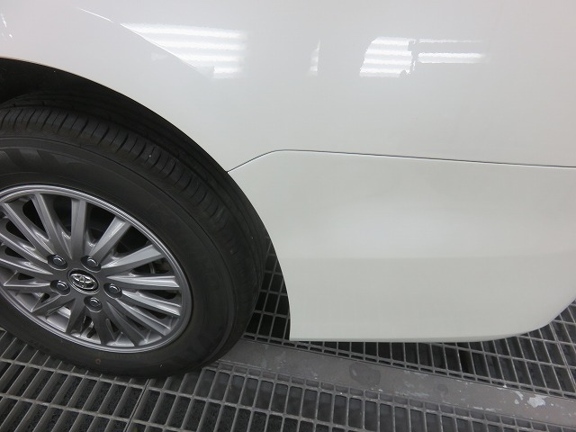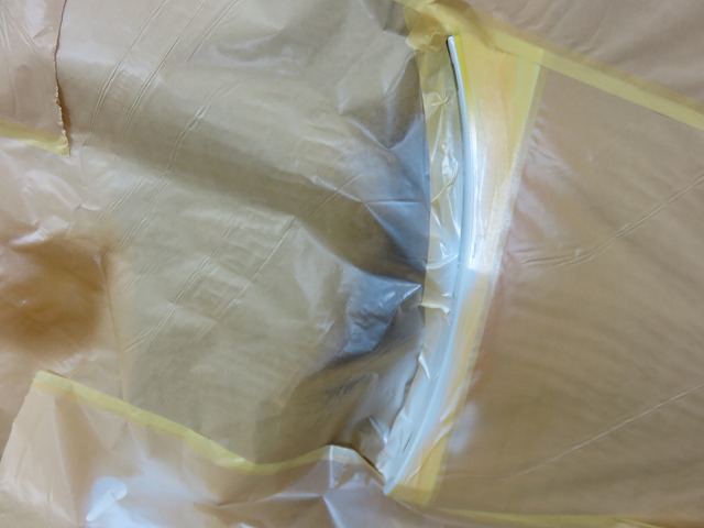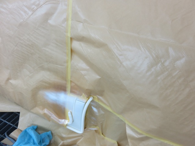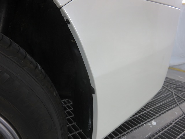 リヤバンパー部分補修塗装。リヤバンパー成型ラインのところで見切り。これは、調色がしっかりできてなければ、出来ない技。カラーベースはエアーブラシ使用。にごし塗装。