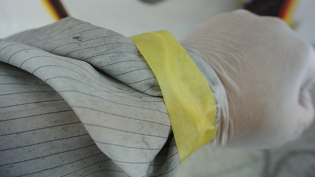 袖とビニ手の間からのホコリも飛ばない様に作業しております。地味な企業努力・・・。