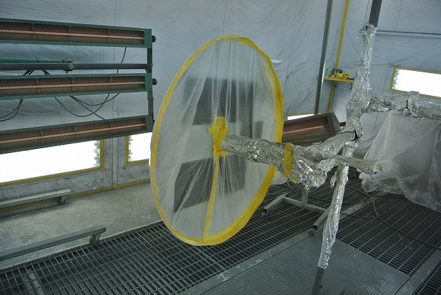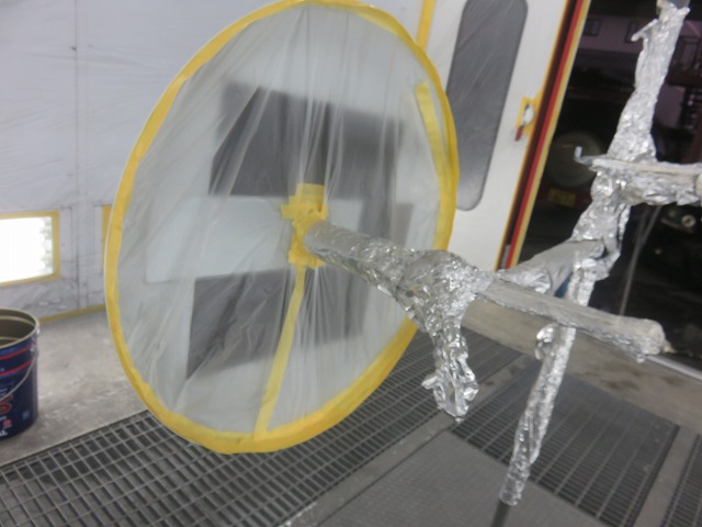 塗装スタンドの塗装ミストが飛ばない様にアルミ箔でマスキング。アルミ箔は巻き付けるとその形を保持してくれて作業性が向上。かつ、アルミ箔は静電気除去作用もあります。車に貼ってるアルミテープと一緒の原理・・・・。塗装前にはアルコールで静電気除去してホコリを寄せ付けないようにしています。もちろんビニールも両面コロナ処理してあります。