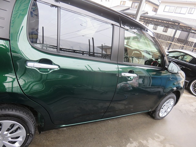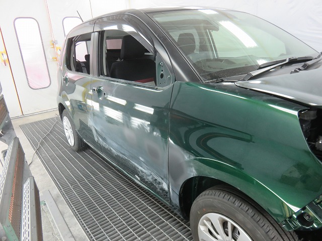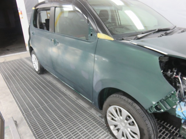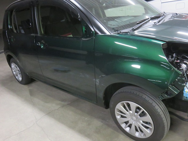 パッソ 右側面 修理のご依頼です。 保険修理での対応です。画像は各部塗装の為分解後の状態。