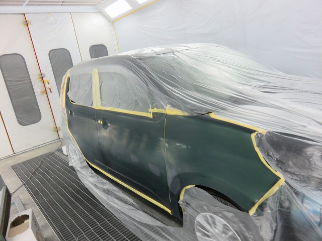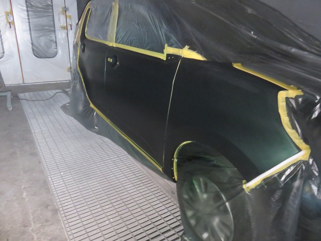 パッソのフェンダーは実は樹脂なんです。ドアはデント棒を使って凹み出し。サフェーサー塗装。
