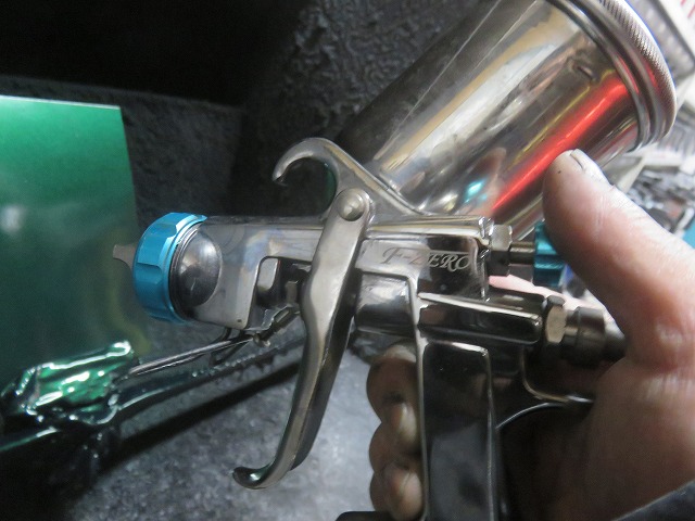 カラーベース塗装。その後電気を消してビデオライトで、ベースの色どまり、ぼかし塗装の状態を確認。