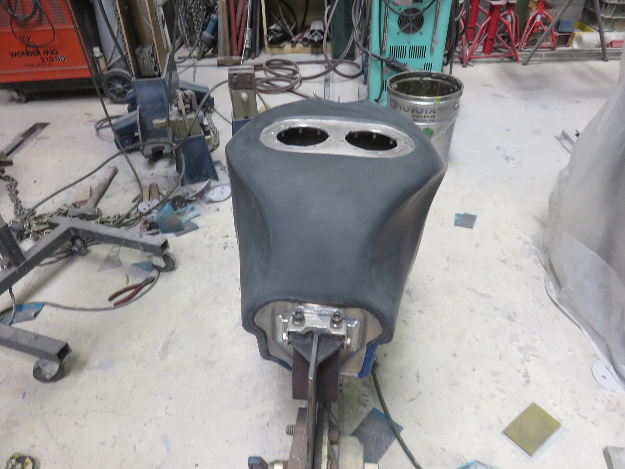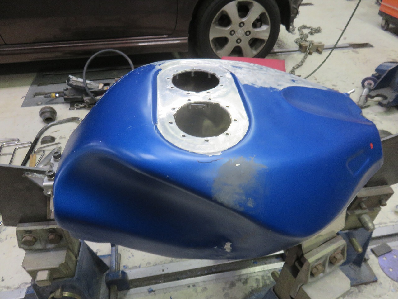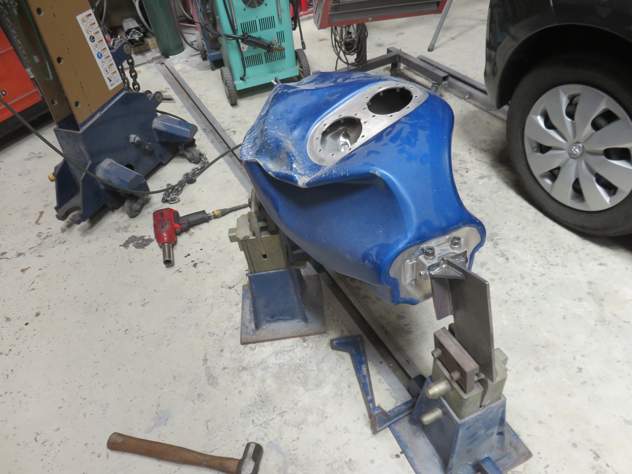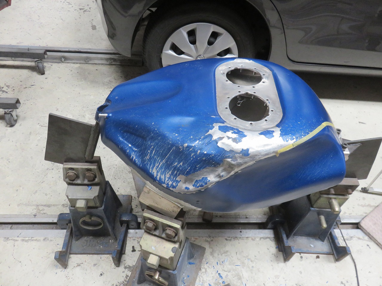 タンク修理のご依頼です。新品のタンクが8時間耐久レースまでに間に合わないということで、急遽修理のご依頼でございます。他社さんでは出来ないと言われたようです。専用修正ジグ作製することによりタンクが固定出来ます。