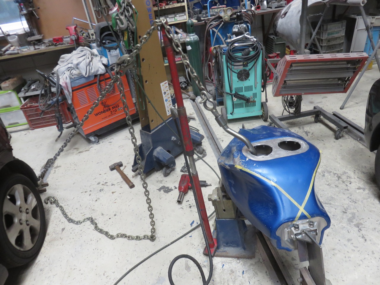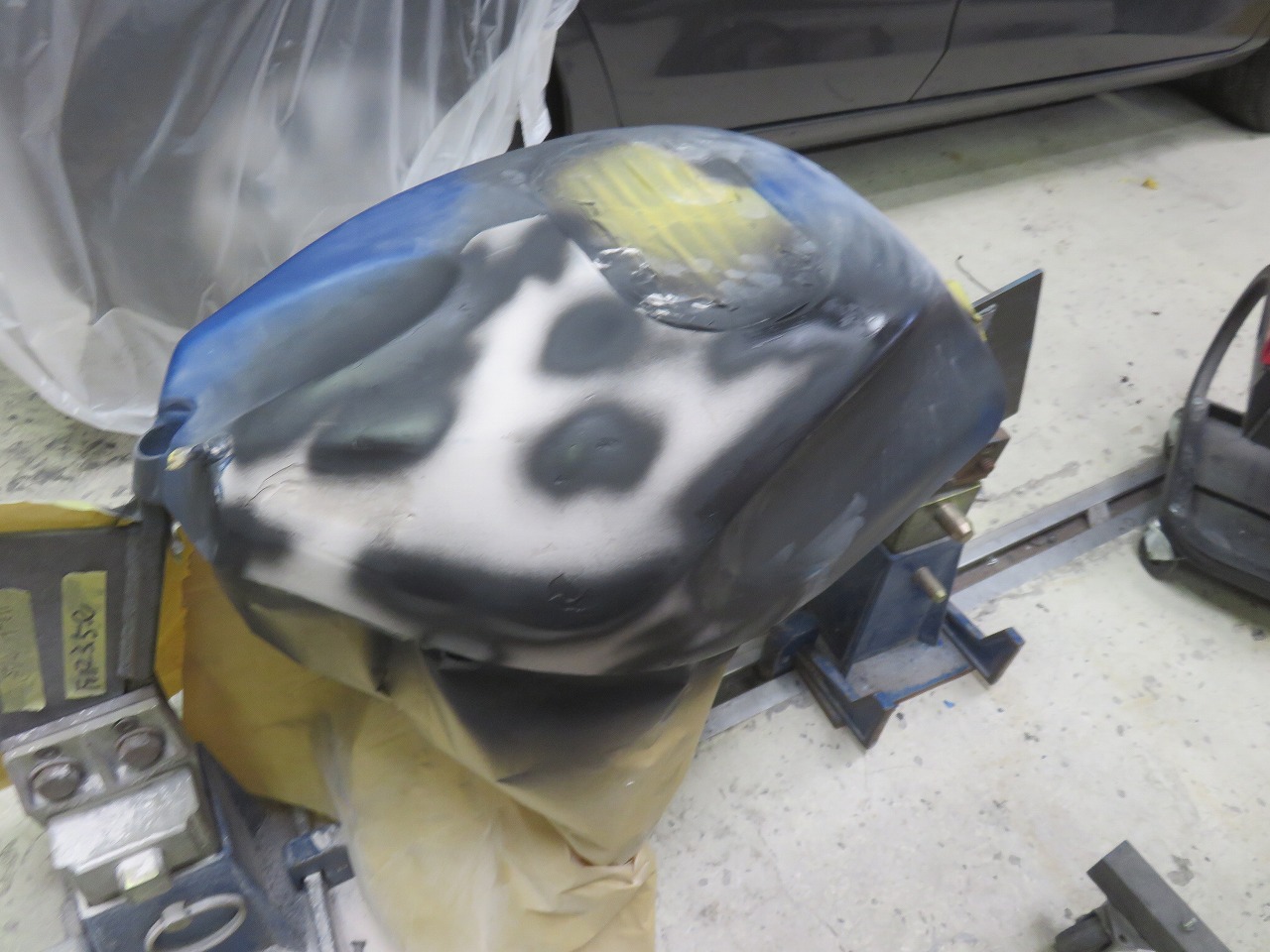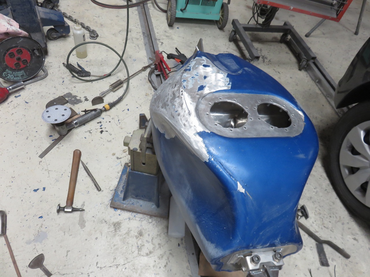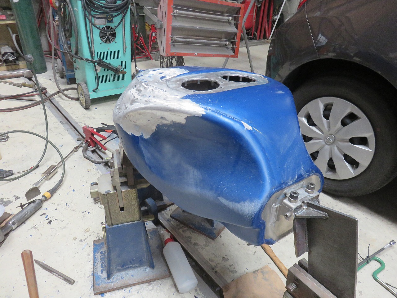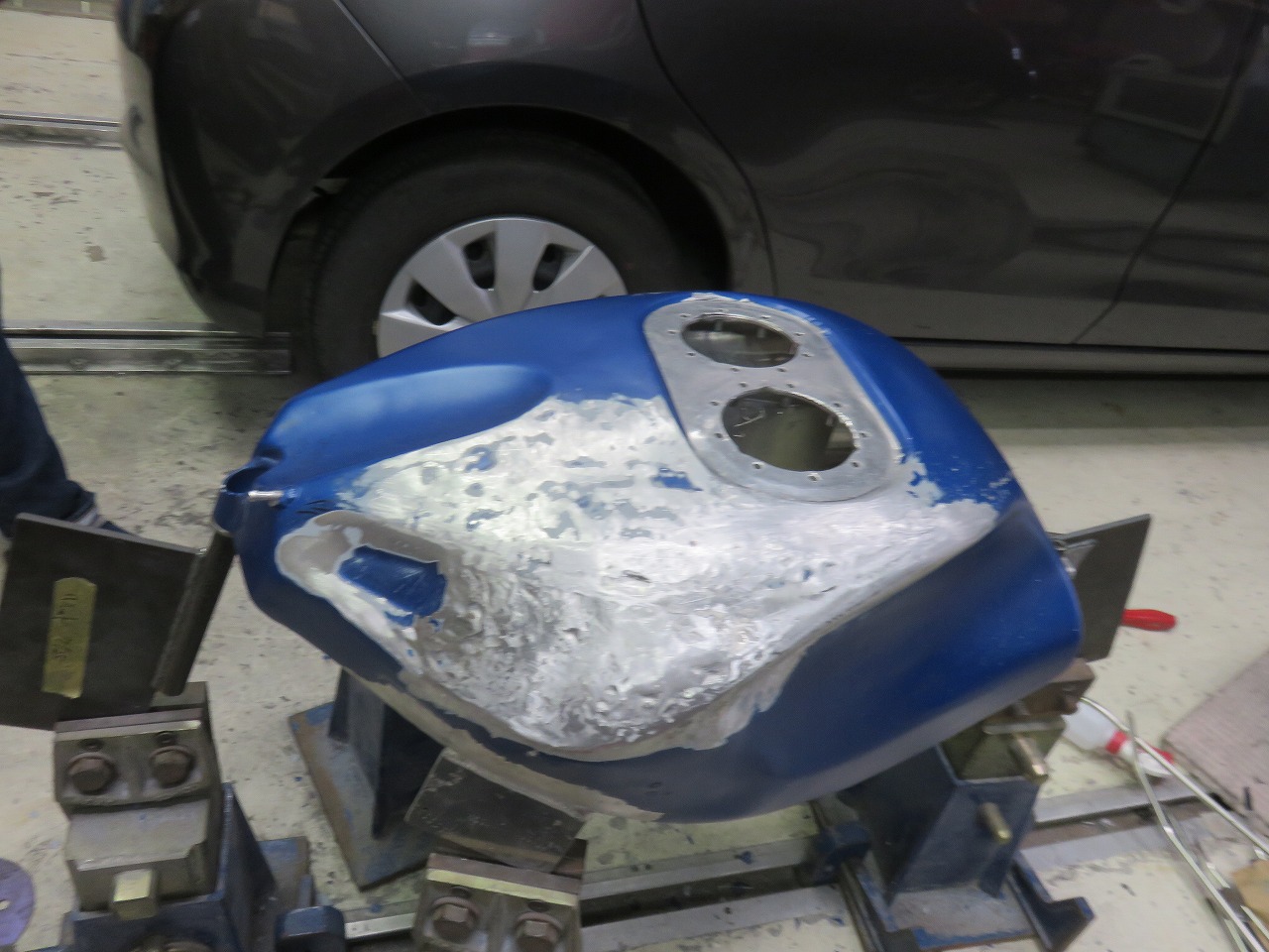 タンク修理のご依頼です。新品のタンクが8時間耐久レースまでに間に合わないということで、急遽修理のご依頼でございます。他社さんでは出来ないと言われたようです。専用修正ジグ作製することによりタンクが固定出来ます。