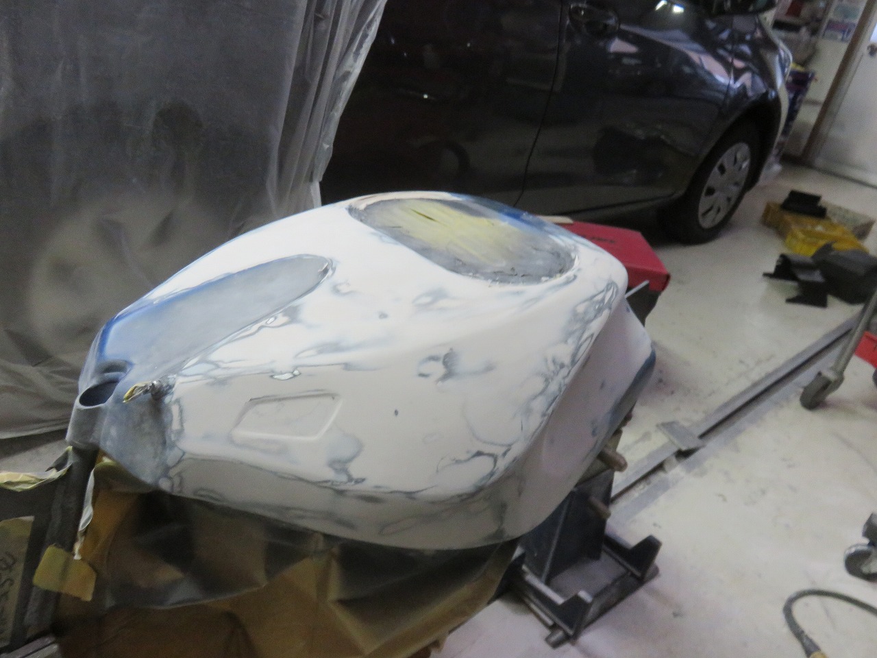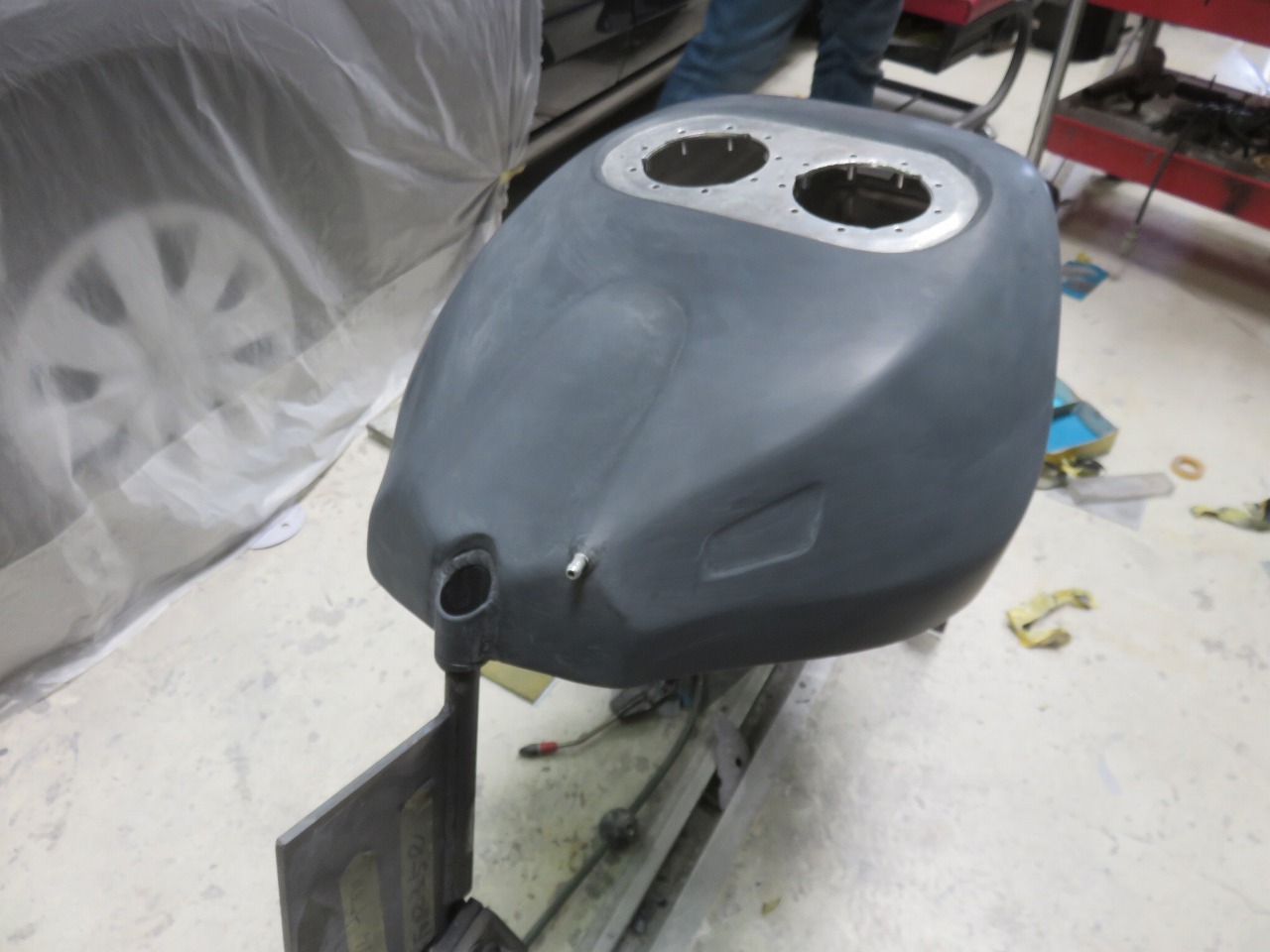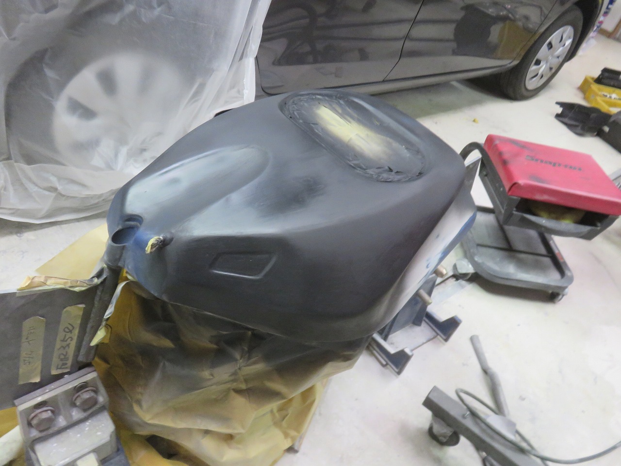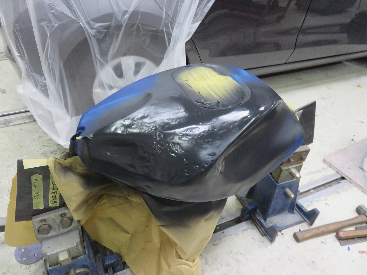 タンク修理のご依頼です。新品のタンクが8時間耐久レースまでに間に合わないということで、急遽修理のご依頼でございます。他社さんでは出来ないと言われたようです。専用修正ジグ作製することによりタンクが固定出来ます。