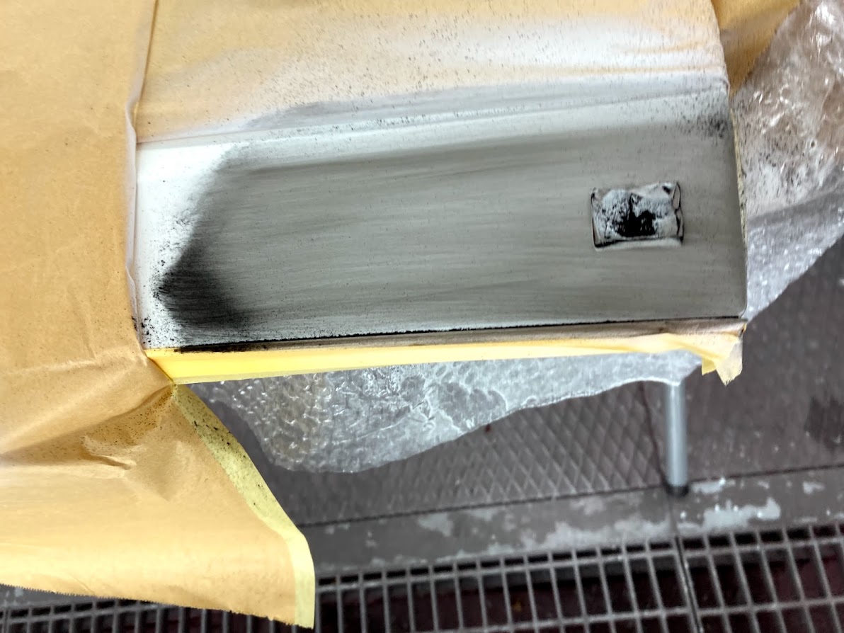 塗装ブースで塗装後 磨き前の画像。 素材色のプラスチック色に調色、艶感を、調整し塗装しております。今回は、ソリッド。