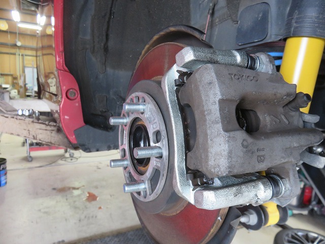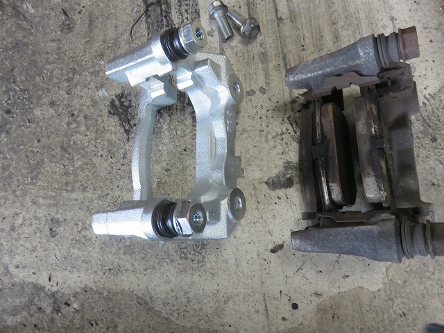 足廻りから異音がするとのことで、私自身試運転をしたのですが、異音特定できず、オーナー様と試運転。そしたらブレーキを踏みながらの低速走行時の異音の事でした。確かにホイールが1回転するごとにギーギーと異音が発生しておりました。リヤタイヤ左右のあたりから出ておりました。ということで不具合特定。キャリパーのガタによる異音が発生しておりました。