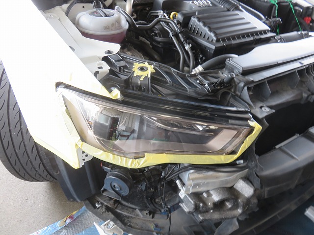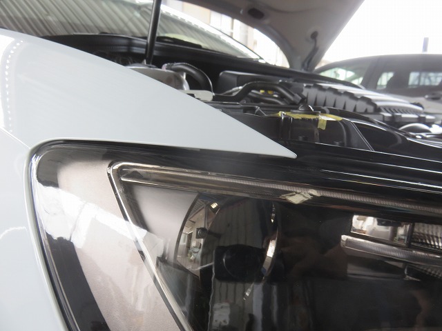 アウディーは国産車と違い修復歴車でなくても、ヘッドランプ脱着作業は付くようにしかつかない訳ではなく、高さ横移動の幅が大きく作業者により取付具合が変わってしまいます。フロントバンパーの脱着でさえ調整の幅があります。その為立て付け等を視野に入れないで作業しますと美しい仕上がりになりません。もともと立て付けもよろしくないのも事実??ではありますが、それを直しながら復元致します。