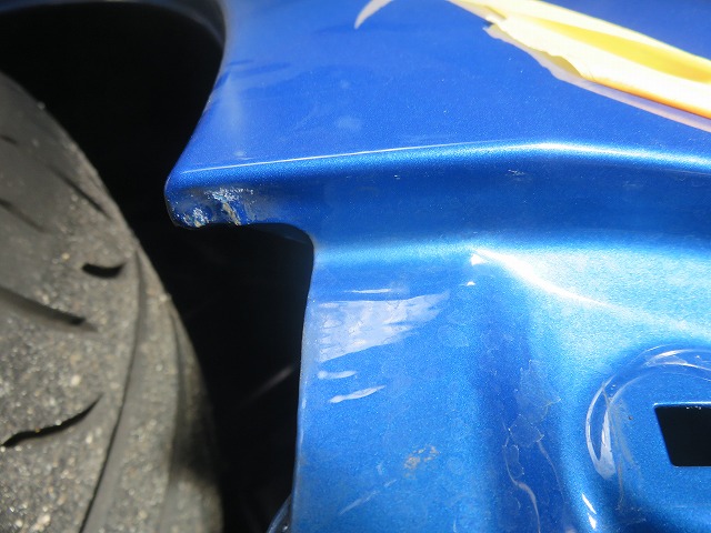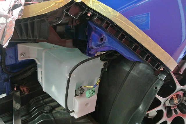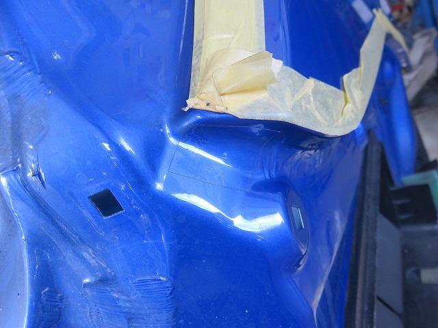 バンパー脱着後ステー取替。バンパーとボデーがこの車干渉する為か、塗膜剥がれ。そしてタッチアップ。オーナーさんとの話し合いの末プロテクションフィルム施工。