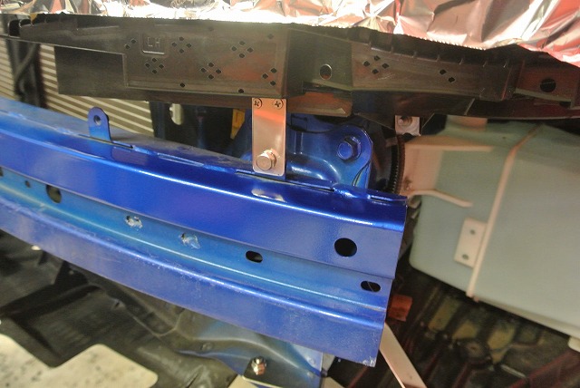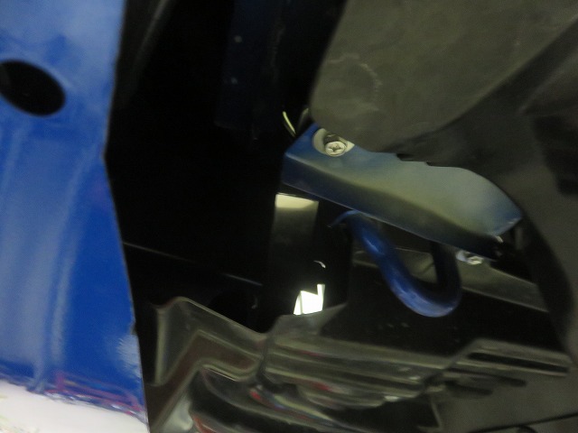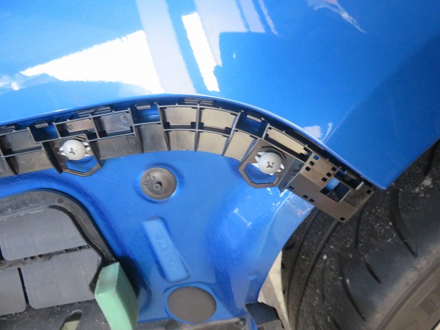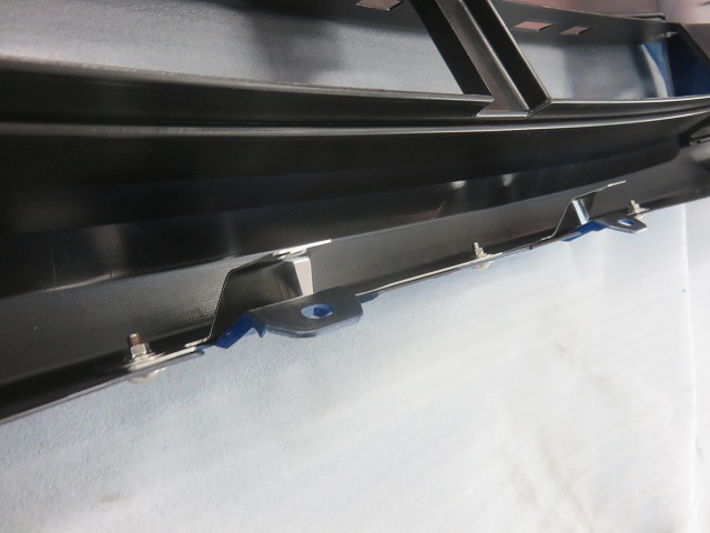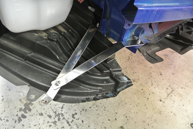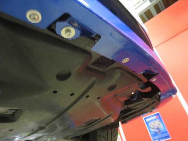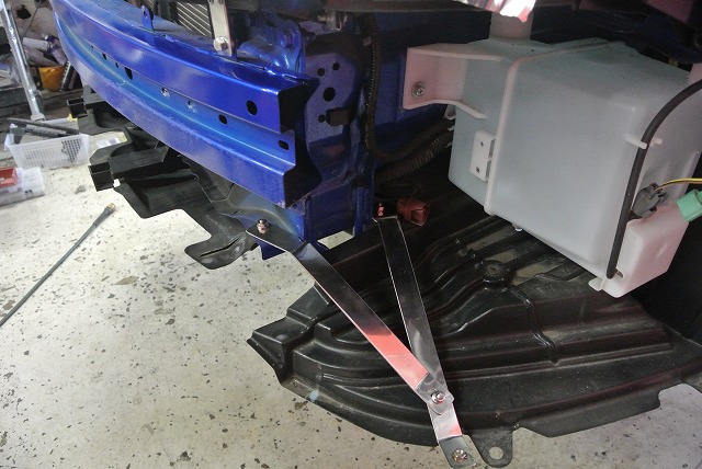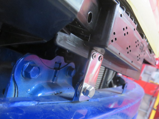 補強ブラケット。 純正の取り付けでは、フロントバンパー下部の取り付けはクリップ止め。左右下部はライナーで共締め。揺するとグラグラです。