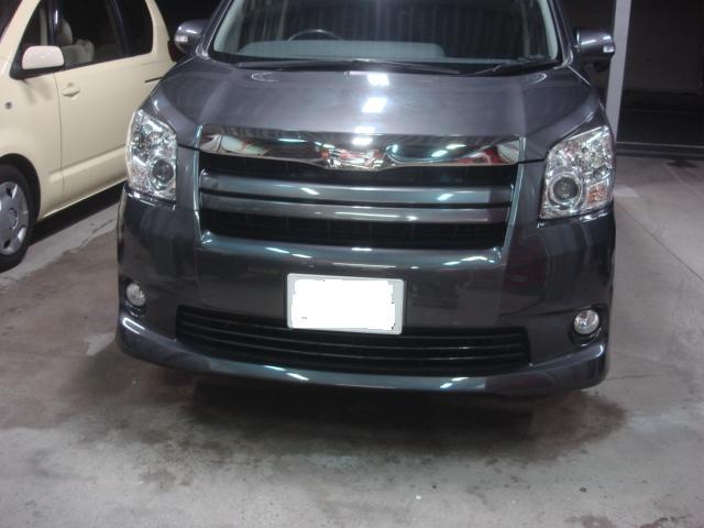 スーパーガラスコーティング施工車でしたのでスーパーガラスコーティングを施工いたします。1時間ぐらい乾燥させた後フロントバンパーを組みつけて、車体に取り付けます。