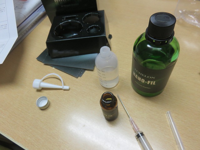 今回は、エシュロンNANO-FIL施工。 本液と硬化液10対1で混合。シリンジで硬化液を計量。