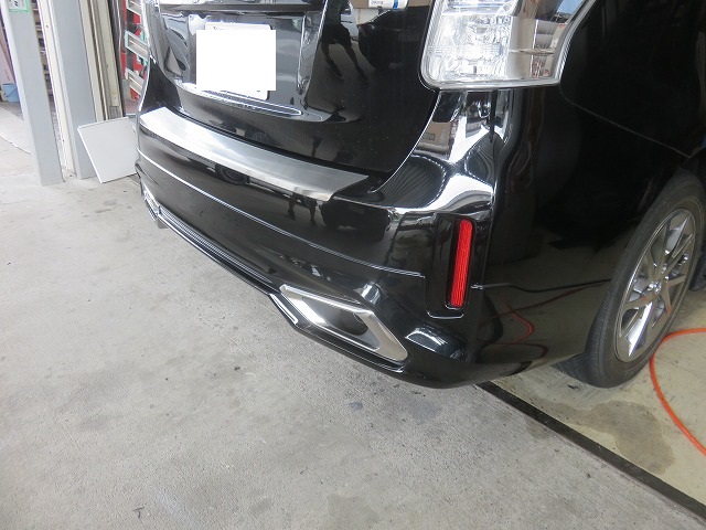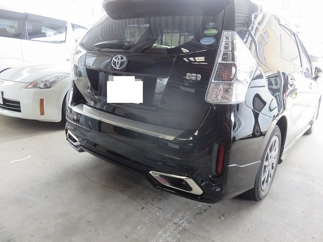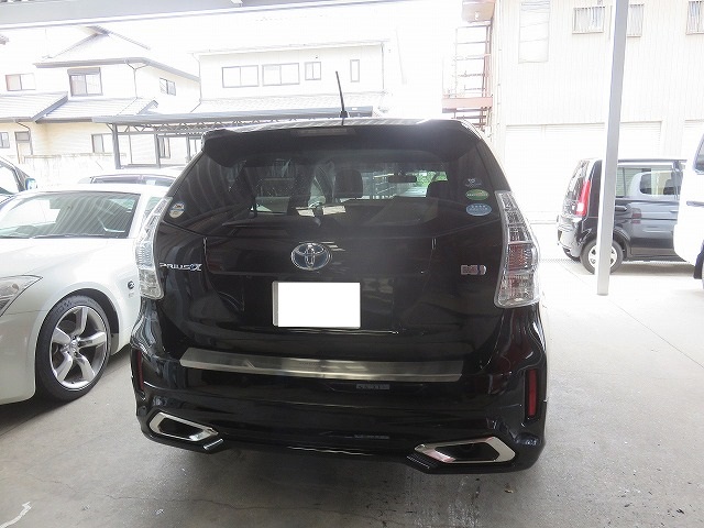 プリウスα モデリスタインテグレートスタイルリヤバンパースポイラー取付になります。オーナー様、三好市からご来店くださいました。商品ヤフオクでのご購入。部品持込みでの取り付けです。剥がした両面テープのり跡が残ってるということで、剥がし料金かかりますよと事前にお見積り後のご来店。なんとオーナー様両面テープののり跡をご自分で剥がしてご来店くださいました。画像は装着後の写真です。隙間が無いようにしっかり取付出来ました。