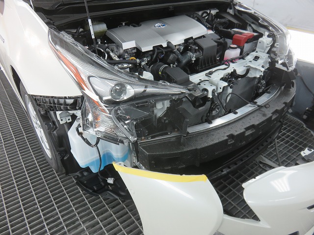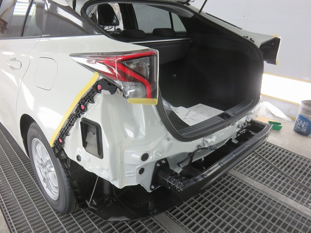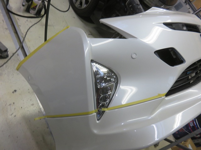 プライマーを塗布する為にフロントバンパーを仮付けし取付位置をマスキング。その範囲内で