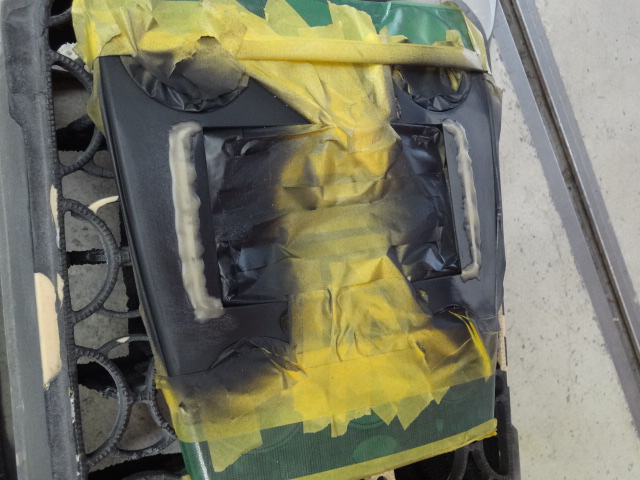 業者様からの御依頼です。色はピアノブラックとのご指定。社外品のアテンンザパネルを塗装してくださいとのご依頼です。間口がワイドパネルからカロッツェリアなどのすこし小さな間口に変更されています。写真はサフェーサー塗装後つなぎ合わせたところがシンナーなどの溶剤で段差が出てしまった為、段差が出てしまった所を少し削りFRPとガラスの粉を混ぜたものを埋め込んだ所です。