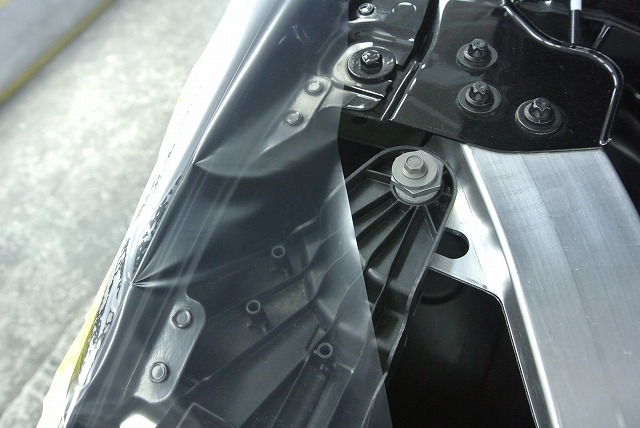お車がとても綺麗でしたので、フロントバンパーを外すのにも手の擦り跡がついてしまいますので、防護してフロントバンパーを取り外しました。一般的には、普通に傷のついてしまいそうなところだけマスキングして作業致します。バンパーのうっすらとした傷も磨いてくださいとのご用命もありましたので、細かい傷も気にされている方と判断しましたので、このような作業を取らさせていただきました。