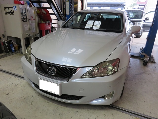レクサスIS(前期)にレクサスIS-F用(前期用)ヘッドランプ(エコパーツ)を取付後ヘッドランプ磨きコーティングそして、各部フロントバンパー傷ありましたのでフロントバンパー1本塗装・フロントバンパーロアガーニッシュ塗装のご依頼です。