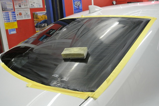 施工対象面にムラなく塗り伸ばします。ガラス面に塗布してから10分以上放置して乾いたマイクロファイバークロスで拭きあげて仕上げます。こんな施工工程でございます。