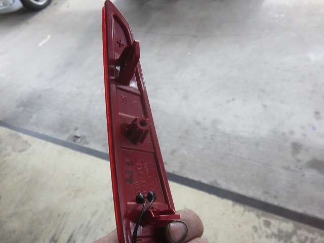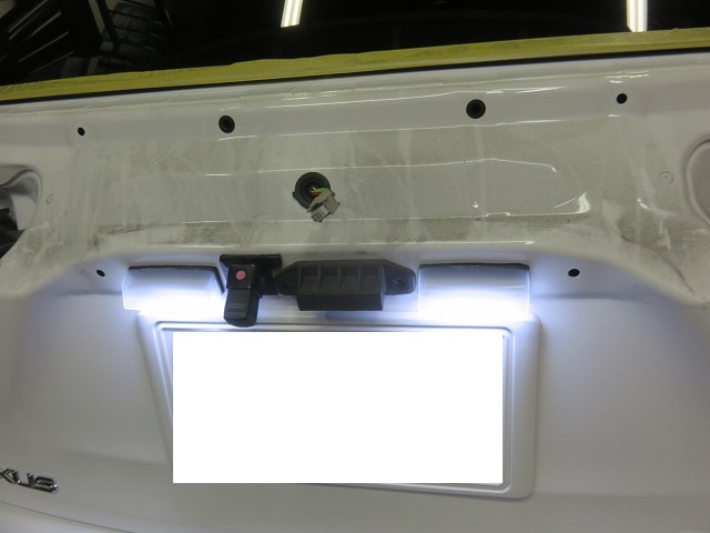 LEDライセンスランプ取替。取替作業には、バックドア内貼り外し。左右テールランプレンズ脱着、バックドアガーニッシュ外し作業が伴います。