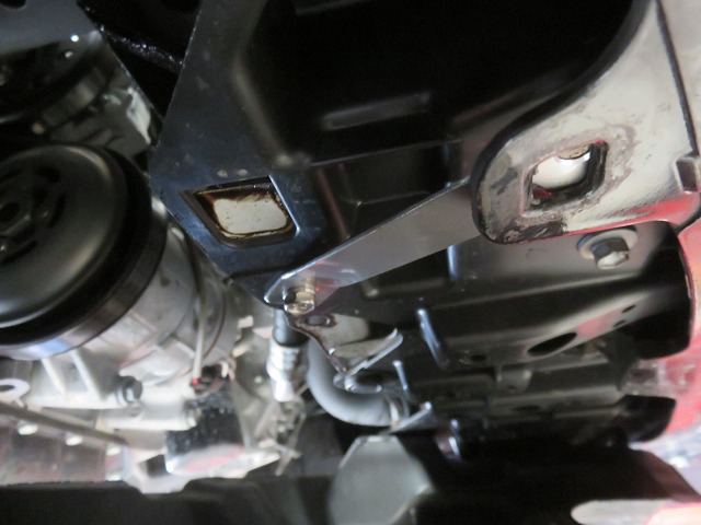 また補強ブラケット取付時にフロントバンパー下側を手前に押し出しながら締め付けますと上部取付部を支点にしてフロントバンパーとフロントフェンダーの隙間を狭める方向に動く為フロントバンパー下がり防止効果も有効でございます。