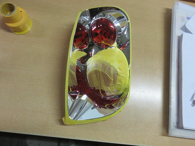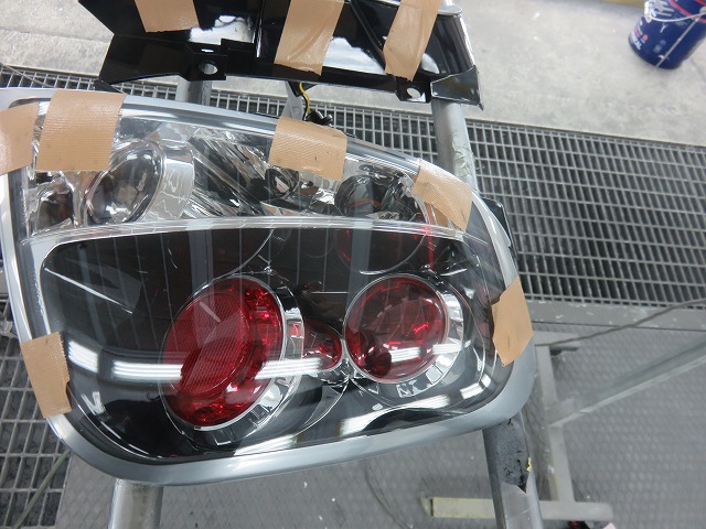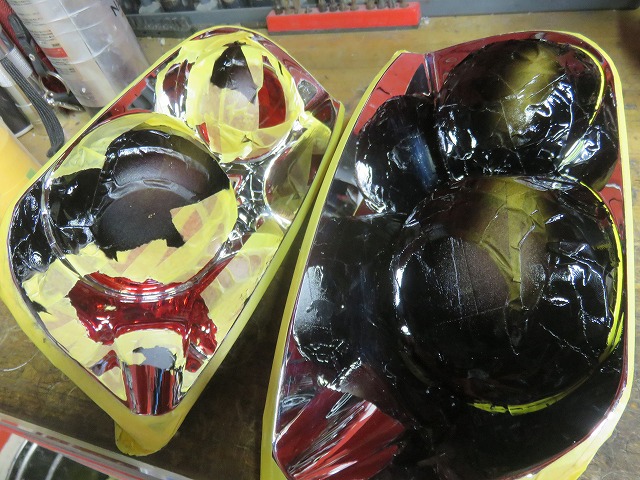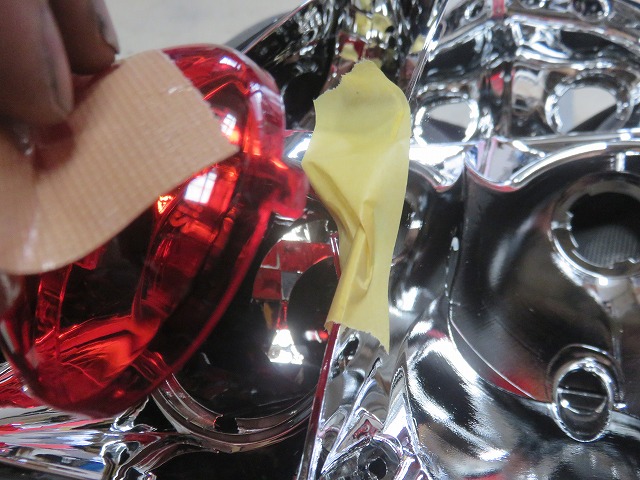 テールのメッキ部分の反射が気になるということでメッキを残したいところは残しあとは艶有りブラックで塗装してくださいとのご依頼。かなりの難関。理由はマスキングがかなりいびつな形状の為です。