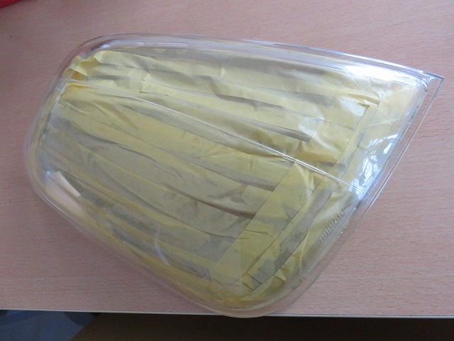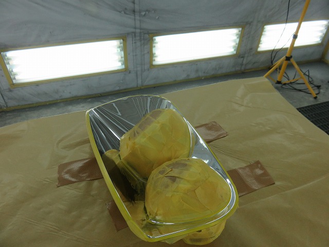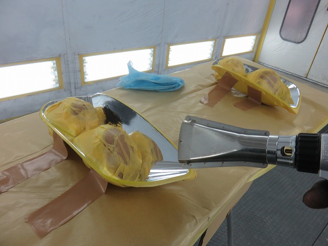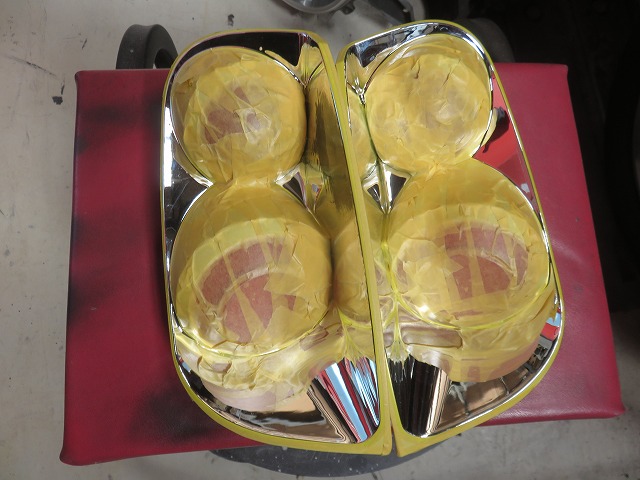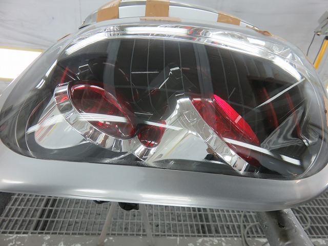 このテールのレンズ面のシルバー枠はレンズ面の裏側に塗装がされていました。外す時にどうしても傷が入りますので、塗装が必要になりました。またレンズ面は、アクリル又はポリカーボネートの為、外装用塗装では、何かしらの不具合、クラック等の2次損傷も予想されますので、ヘッドランプ専用クリアーなどの、保護被膜を作ってからの塗装になることになります。