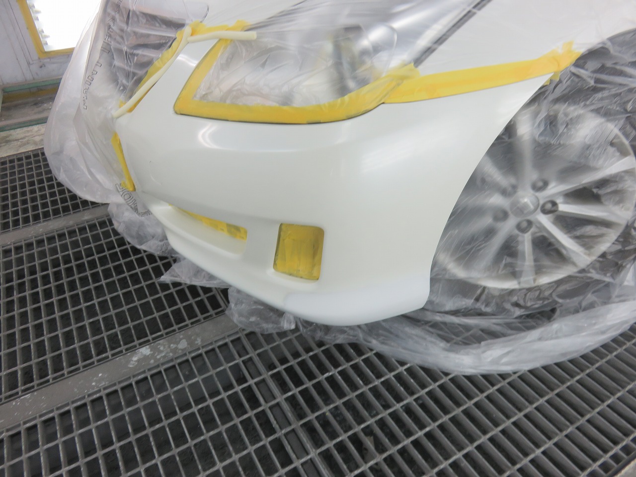 左フォグランプ・ロアグリルを外します。 フロントバンパーだけの塗装でも車全体マスキングします。
