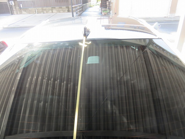 リヤ硝子の中央縦線の熱線で中心を取ると位置決めしやすい・・・。