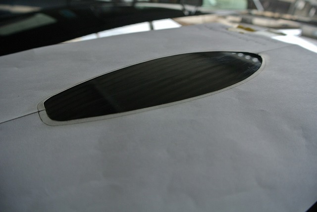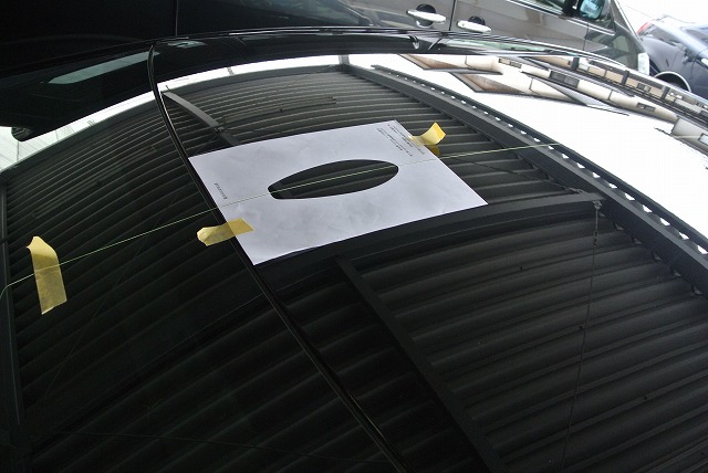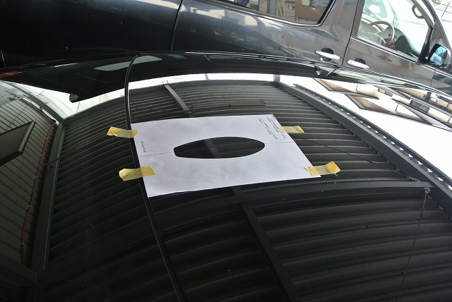そのラインに付属の位置決めシートをルーフプレス部始まりから位置決めシート末端に合わせます。(中央部ラインが引いてあるところ)これでルーフアンテナを取りつける位置が決まりました。