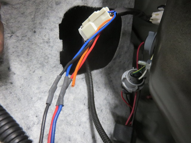 リヤバンパー脱着時に備えて接続端子で取付。マフラーから近い為配線はアルミテープで保護。
