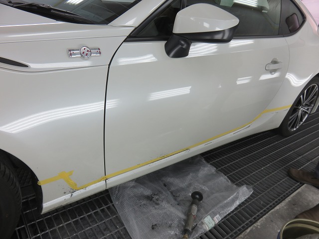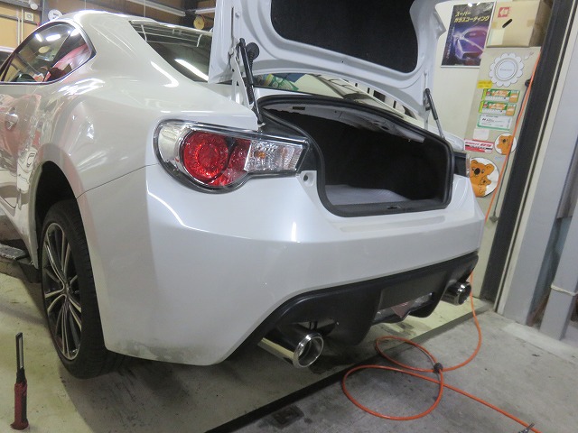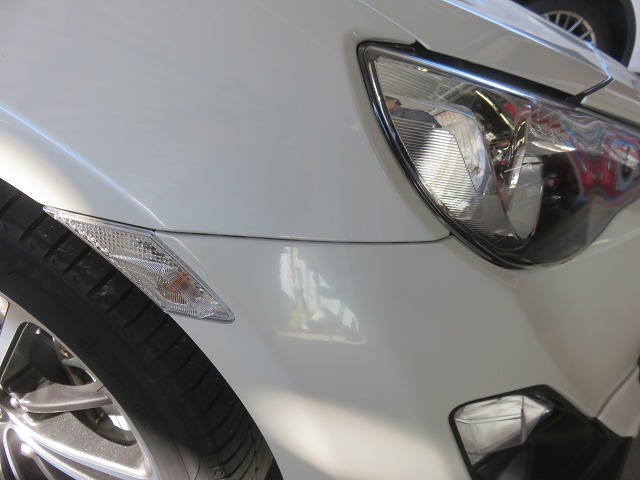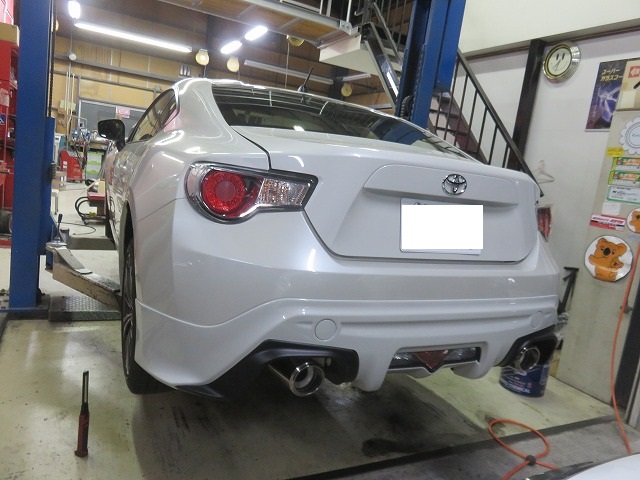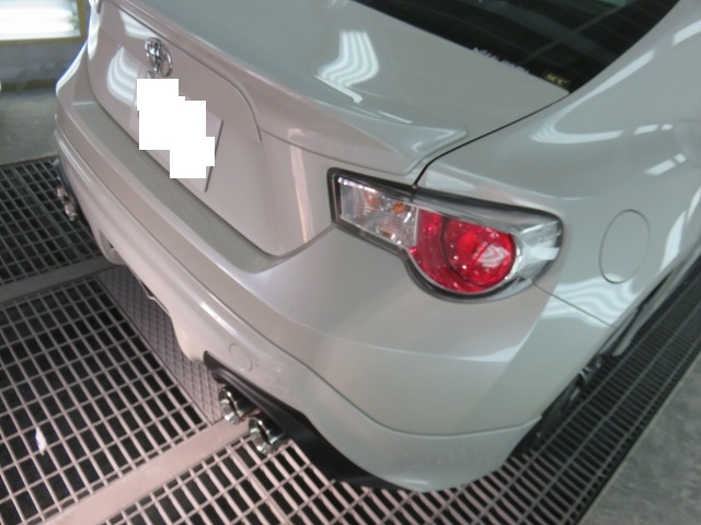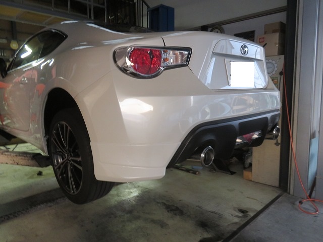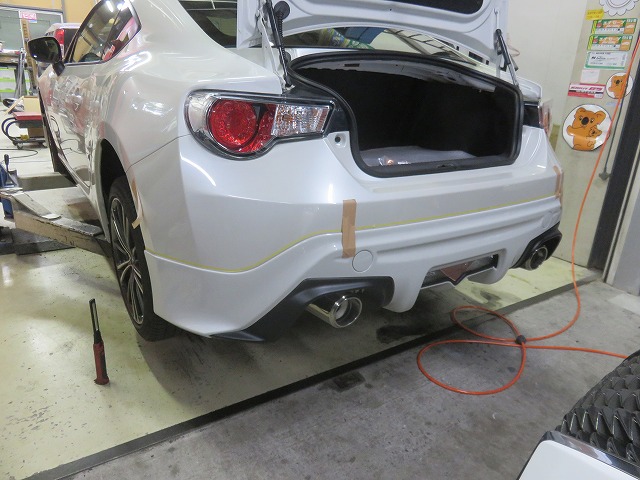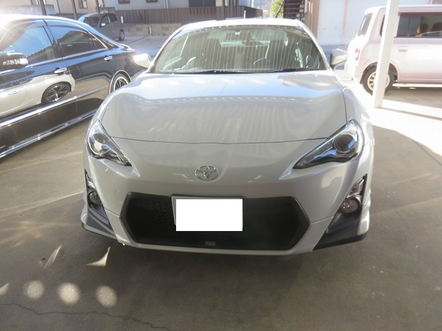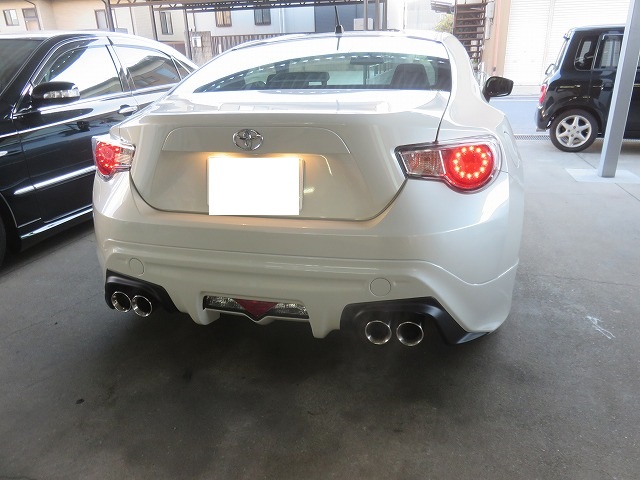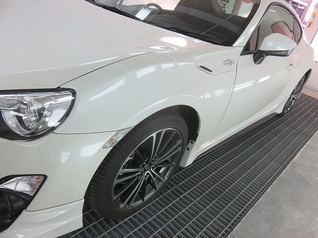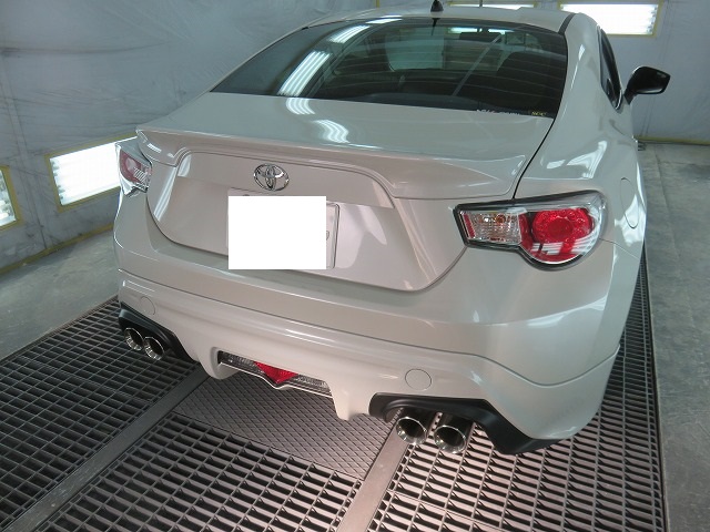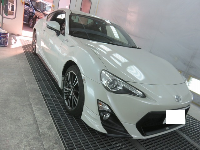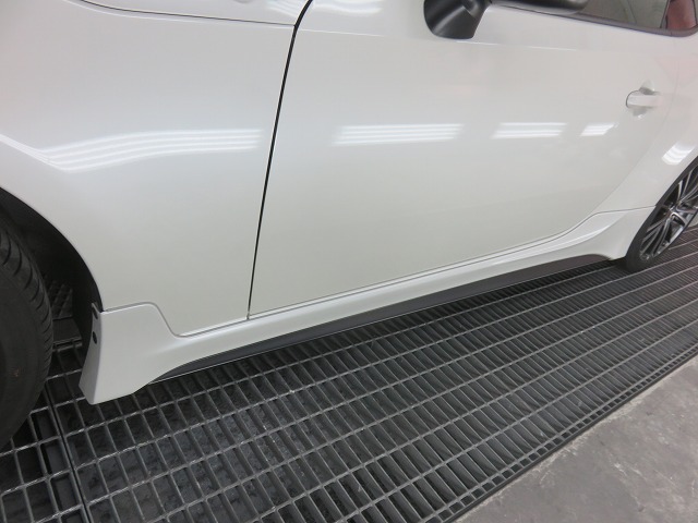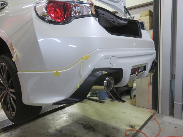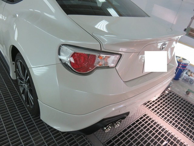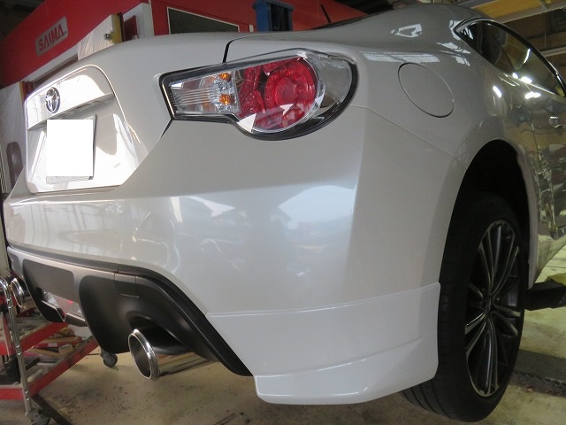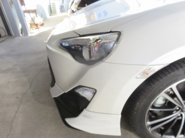 86 フロントバンパーガタ修正 TRDサイドスポイラー位置調整 リヤスポイラー取付のご依頼になります。猛烈に綺麗な86です。オーナー様愛知県三好市からご来店くださいました。