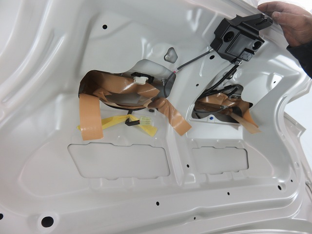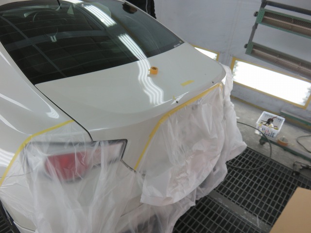TRDリヤトランクスポイラー取付トランク穴あけ作業の為のマスキング。鉄粉は錆を誘発しますので