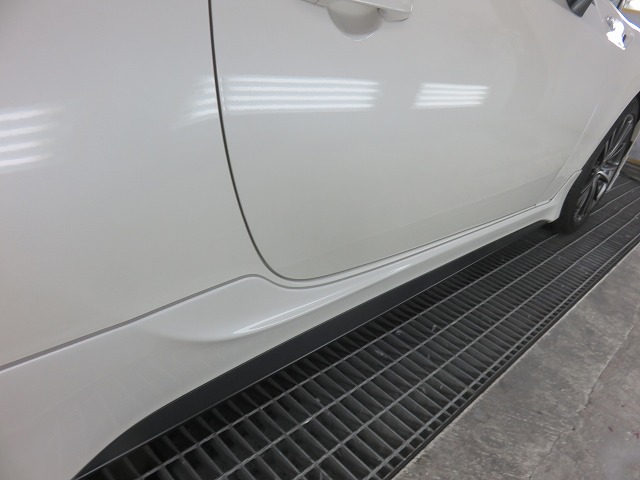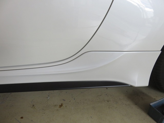 TRDサイドスポイラーの位置調整。クォーターに純正のプロテクションフィルムが施工されていたため