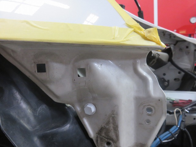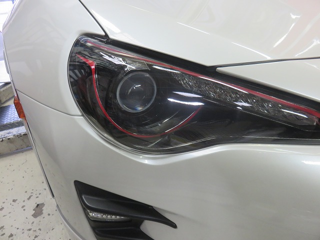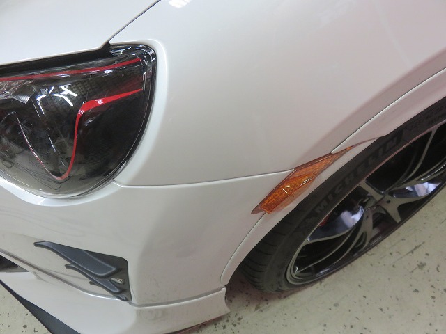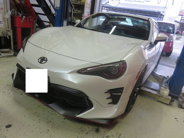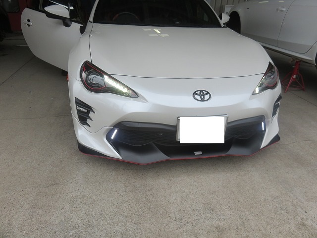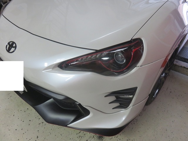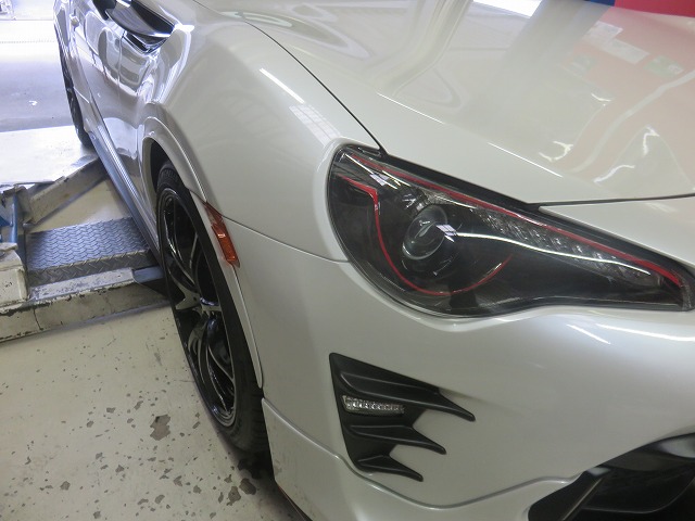 86前期 後期フロントバンパー仕様フロントバンパー下がり修理のご依頼になります。オーナー様福井県からのご来店になります。ディーラーさんで何度も施工の挙句フロントバンパー交換したほうがイイですよと言われ、前期物を交換するよりも後期ものに交換しようということで交換されたようでございます。カラーナンバー37Jは後期カラーに設定はなく、新品を再塗装されたそうでございます。後期型にしても・・・・下がりました。3年越しのお悩みの末、ご来店頂きました。