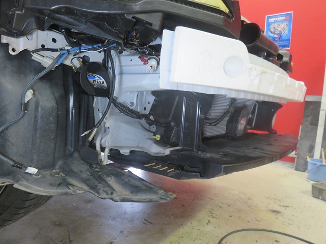 PIAA世界最薄ホーン。ハイローで青色ラベル赤色ラベル。車両のコンセプトからしてロアグリルからホーンが若干見えますので、オーナーさんどっちにつけますかと質問してみました。予想どうり赤を中央で・・・。