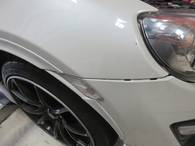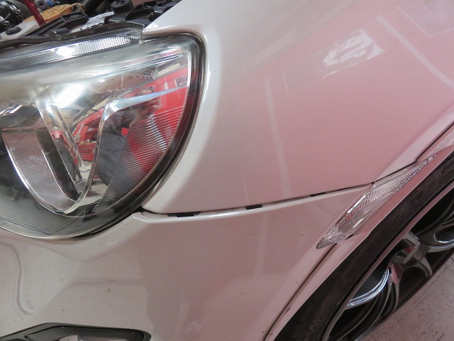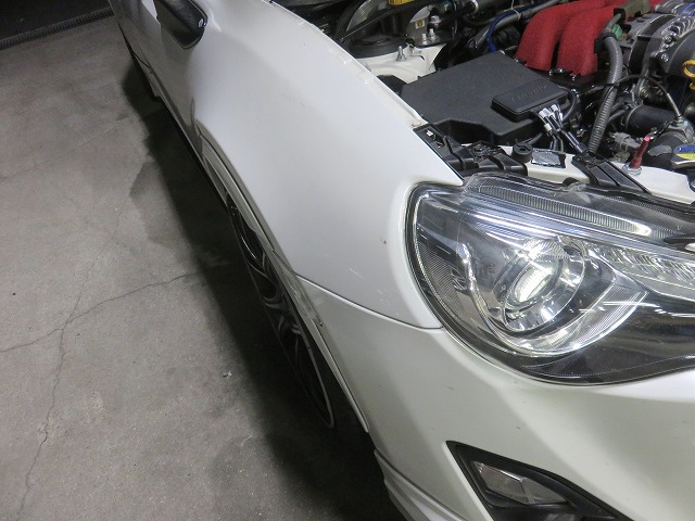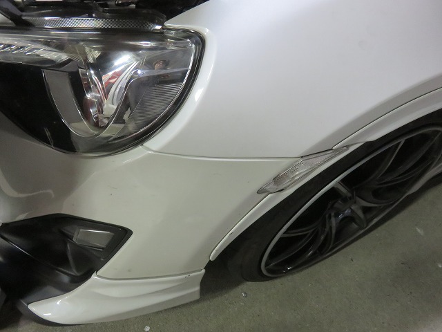 86 トラストボルトオンターボキット取付車両 バンパー下がり修理のご依頼です。86・BRZでトラストボルトオンターボキット取付車両はエンジンルーム内の温度がかなり上昇してしまう為、フロントバンパーも高温になり当社ブログで修理内容はご存知かと思いますが、従来の対策では、フロントバンパーが高温にさらされる為、素材が柔らかくなりダウンフォースを受けると爪部の勘合から外れ、フロントバンパーが下がってしまう症状がございました。