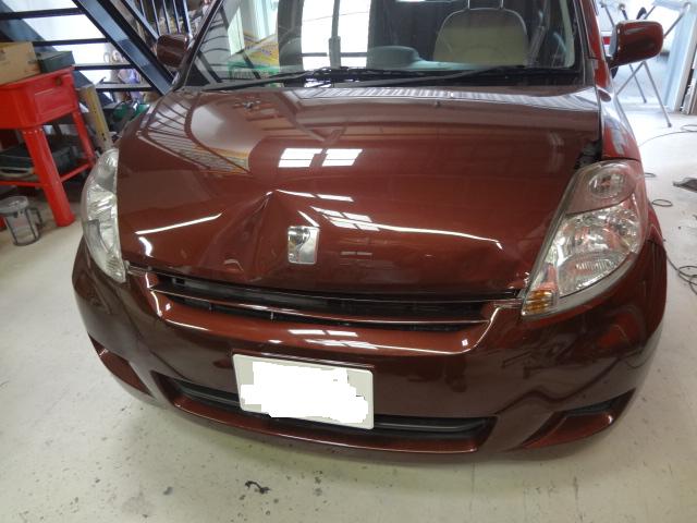 新しいサポート取り付けて両端のボルト部で修正。寸法道理に修正。新しいボンネットを取り付けて左右フェンダーのすき間調整。