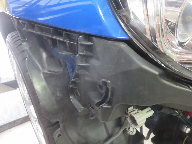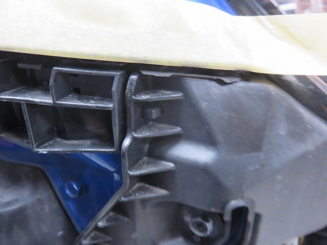 片方だけ爪部勘合部が外れてしまってます。ヘッドランプ下あたりの勘合部に力がかかってしまって外れてしまったようです。