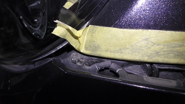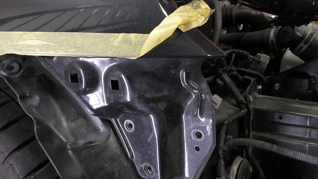 フロントバンパー外し中。取付部亀裂損傷。鈑金屋さんでなければ、直せないと思います。