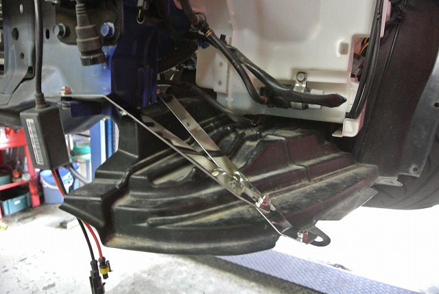 フロントバンパー組み付け後サイド補強ステーにライナーはまだクリップ止めはしない状態でビスにワッシャーを入れ仮締めします。