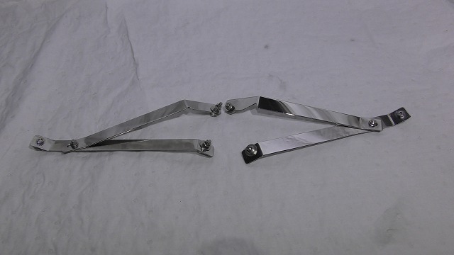 作業性向上の為ナット部をTIG溶接にて溶接。個体差、またはフロントバンパー下部コーナー部の前後の取付調整が出来る様に長穴加工。ステーを片側2本にすることにより前後のたわみを無くす様に改良。後方に押される力を阻止抑制する為に2mm厚のステンレス板を使用。(後方は、1.5mm厚)ステンレス簡易鏡面仕上げ。取付説明書付属。