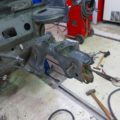 まず荒出しフェンダー部鉄板痛めないようにはんだにてひっぱりだしました。ドアも車両固定して(チェーンにて固定)修正機にて引っ張ります。